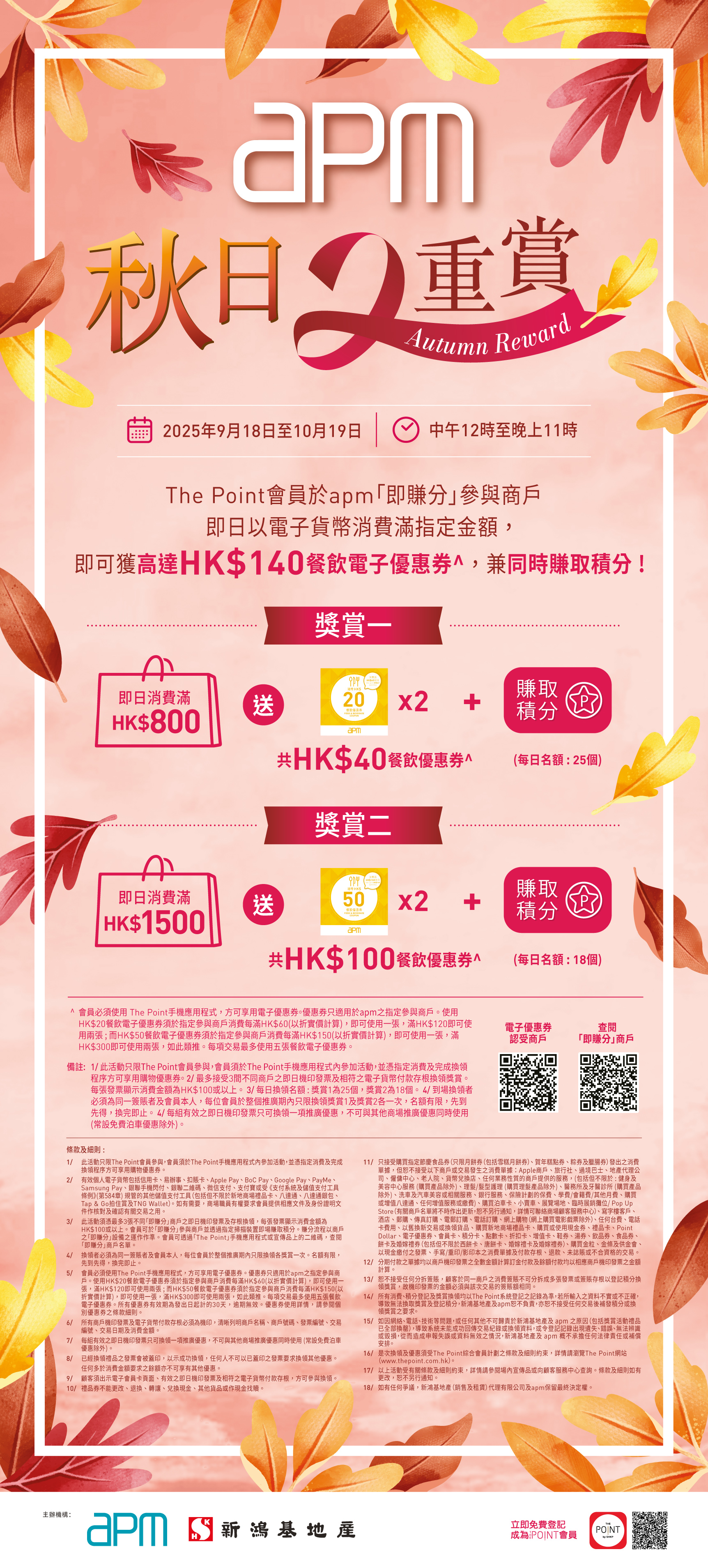 於The Point活動頁面登記「參加活動」,並於 apm「即賺分」參與商戶以電子貨幣即日消費滿指定金額,即可獲高達 HK$140 餐飲電子優惠券^,兼同時賺取積分!
